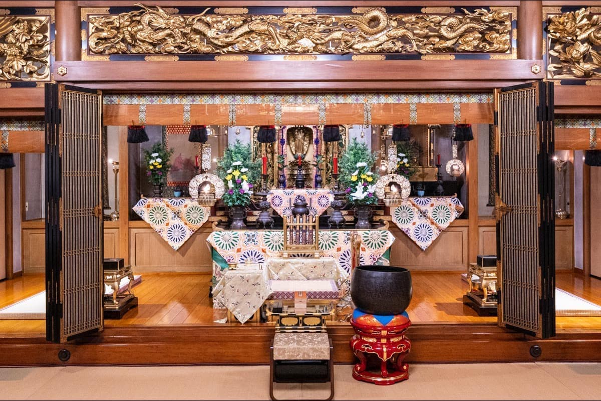 本尊の阿弥陀如来を安置した内陣と、参拝者が集う外陣のある真宗様式の本堂です。椅子席で40人がお参りできます。