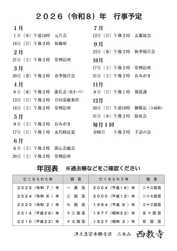 | 元旦会(1月1日) | 元日におつとめする法要です。年頭に当たって、お念仏をいただく生活の第一歩を踏み出します。 |
